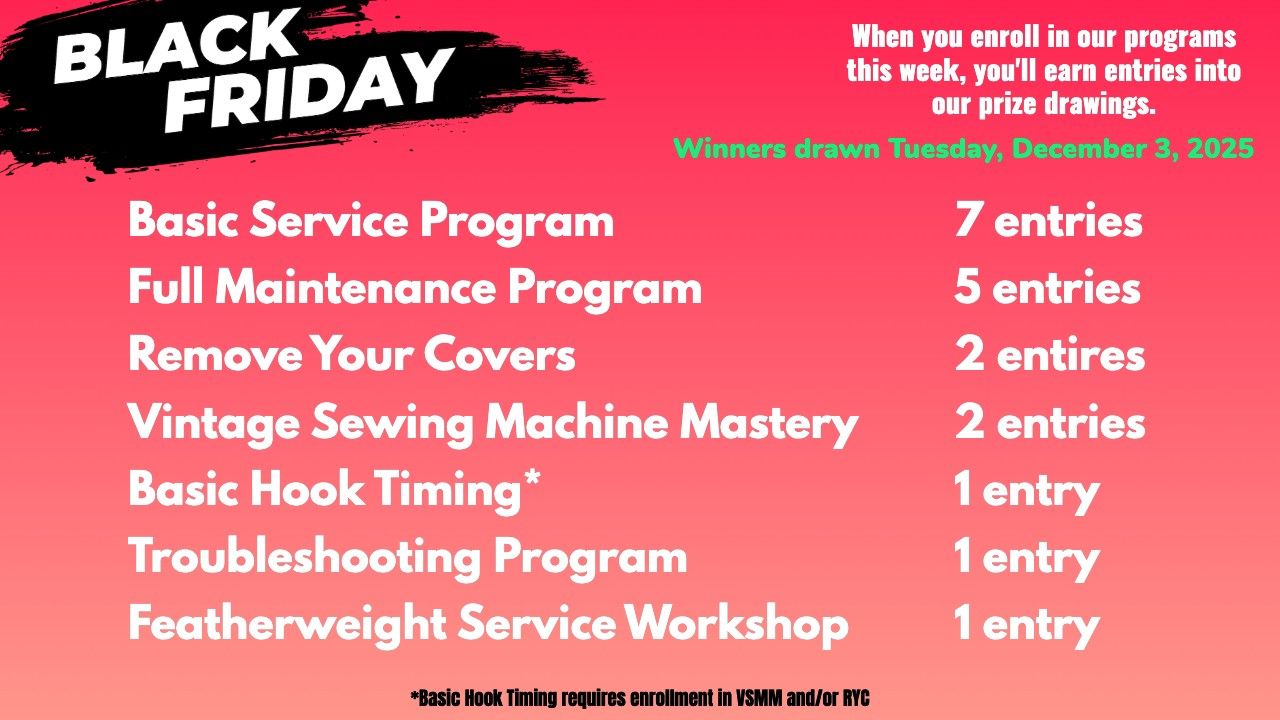 This bundle features all of our current programs for troubleshooting, routine maintenance of both modern and vintage machines, restoration of older machines, motor service & rewiring, and Featherweight Service.