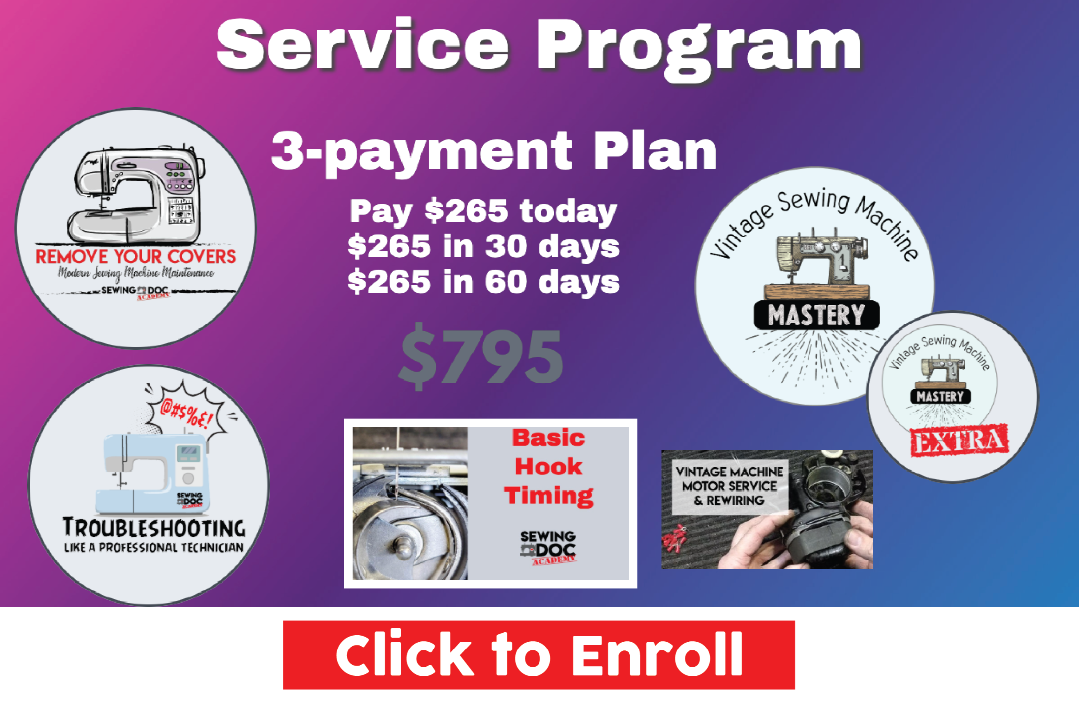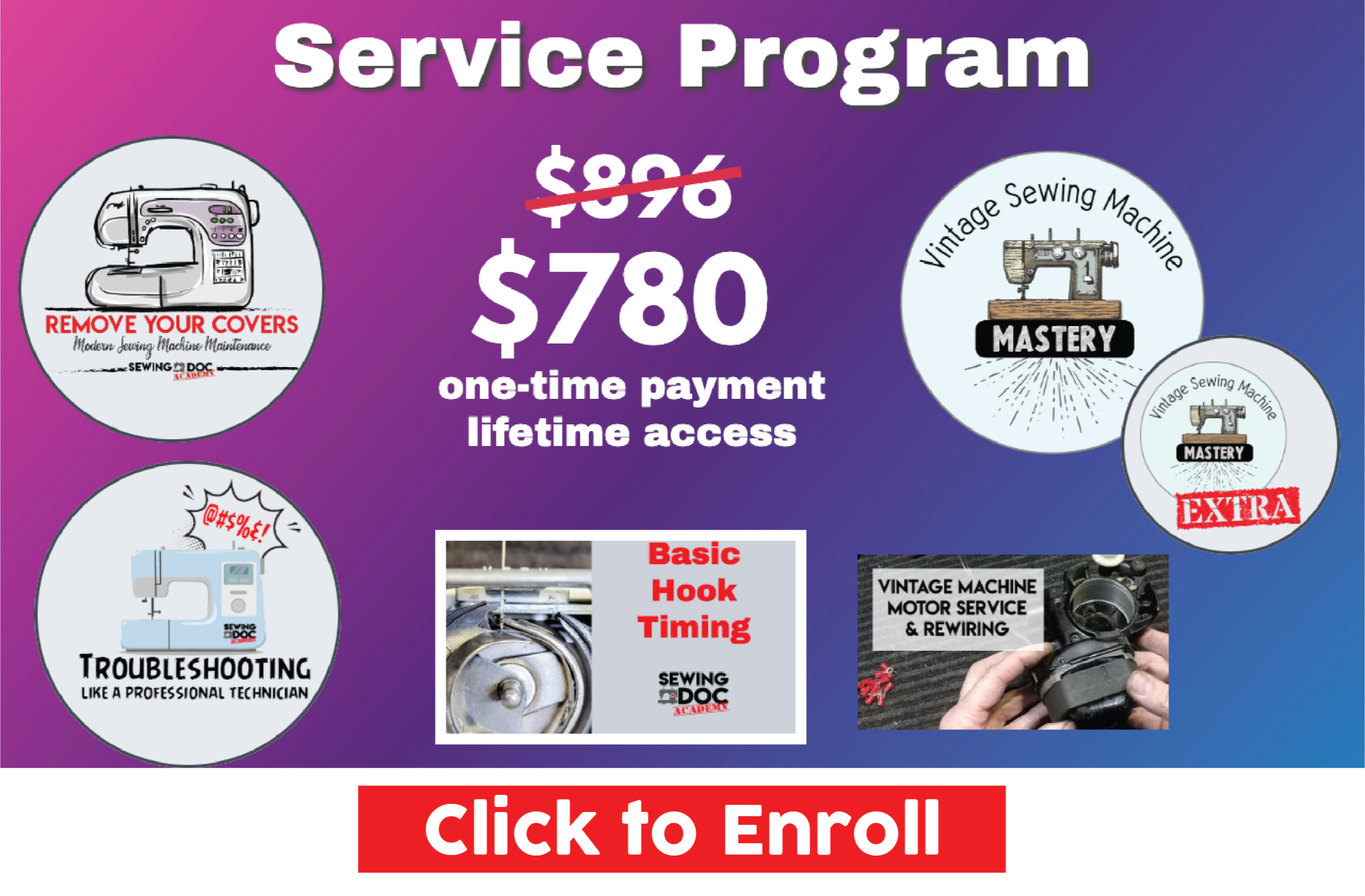 Basic Hook Timing is the first step beyond routine maintenance, moving into service. This program will teach you everything you need to adjust the hook timing on most modern and vintage machines - it's the most common of all the adjustments. This program is a great add-on for home sewistst that need to make this adjustment, and the first step in building skills for business, retirement income, or volunteer work. Remove Your Covers and/or Vintage Sewing Machine Mastery is required.